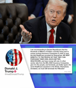 “I am recommending to Senate Republicans that the Hundreds of Billions of Dollars currently being sent to money sucking Insurance Companies in order to save the bad Healthcare provided by ObamaCare, BE SENT DIRECTLY TO THE PEOPLE SO THAT THEY CAN PURCHASE THEIR OWN, MUCH BETTER, HEALTHCARE, and have money left over.” (Excerpt from a Truth Social post)
